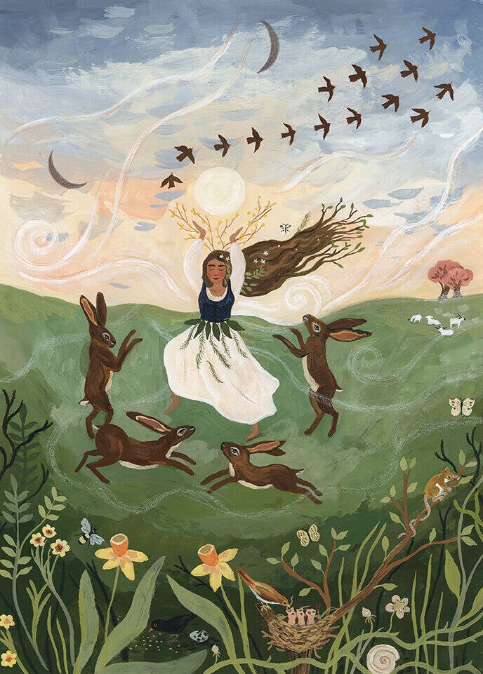 Lang geleden, toen de winter nog over het land heerste en de aarde in haar greep hield, werd de godin Eostre wakker uit haar winterslaap. Ze voelde hoe de wereld smachtte naar warmte, hoe de harten van de mensen en dieren verlangden naar het nieuwe begin. Ze sloeg haar mantel van sterrenstof om zich heen en trok door het land, overal de eerste bloesems uit de aarde roepend.