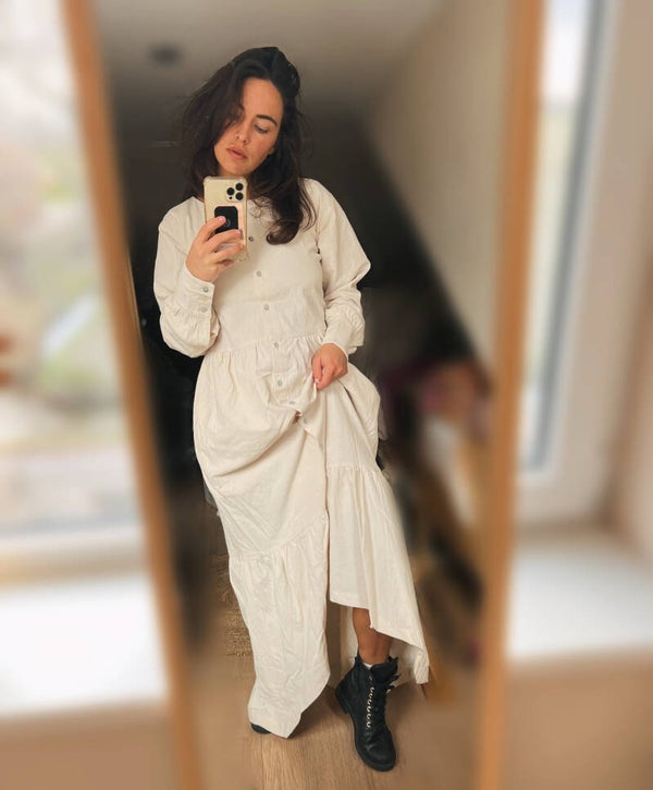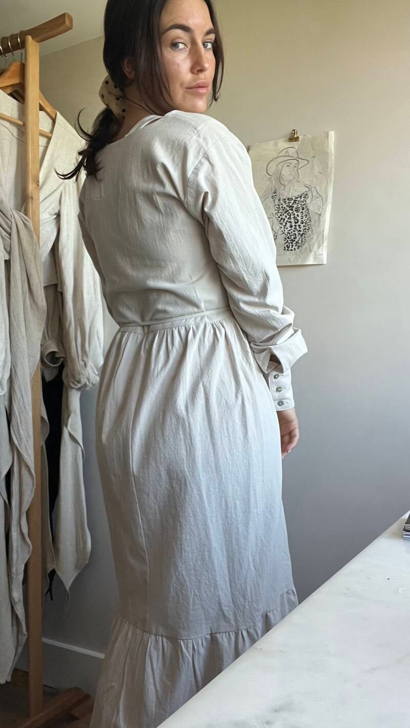 100% organic wrinkle cotton in a gorgeous neutral color. This dress has a perfect fit for before, during and after pregnancy/breastfeeding. Playful with our signature shell buttons from bottom to top and on the sleeves to create your most comfortable fit.