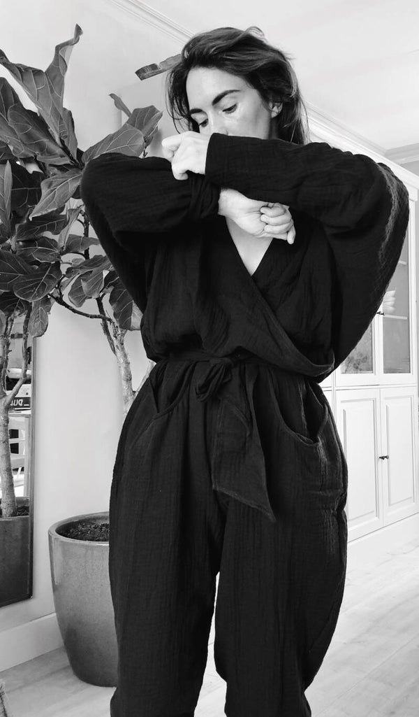 Deze jumpsuit is pure zachtheid in vorm. Ze voelt als een omhelzing van binnenuit. Ik hoop dat ze jou net zoveel vreugde en comfort mag geven als ze mij geeft. Dit is een stuk om voor altijd te koesteren. Aankomen of afvallen? Geen enkel probleem. De Manoah is een oversized model dat je met het lint mooi kunt aanpassen aan je vorm, je stemming of je fase in het leven. De overlappende V-hals geeft een nonchalante uitstraling, alsof je zegt: ik ben hier, op mijn gemak, en ik straal. Rol de mouwen of broekspijpen op zoals jij dat fijn vindt. Combineer haar met een grof gebreid vest, een trui, of juist een kanten bralette voor een vleugje vrouwelijke speelsheid.