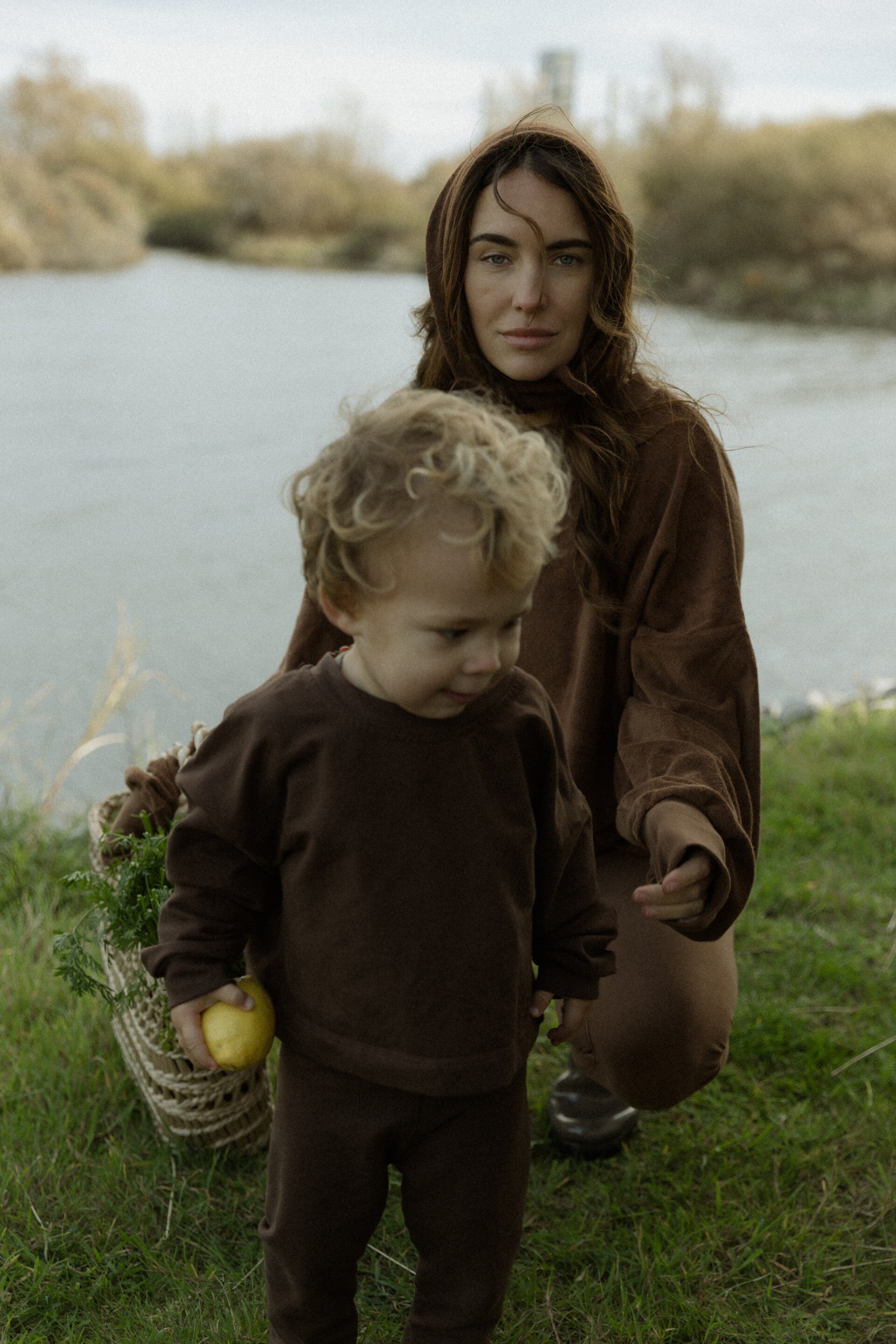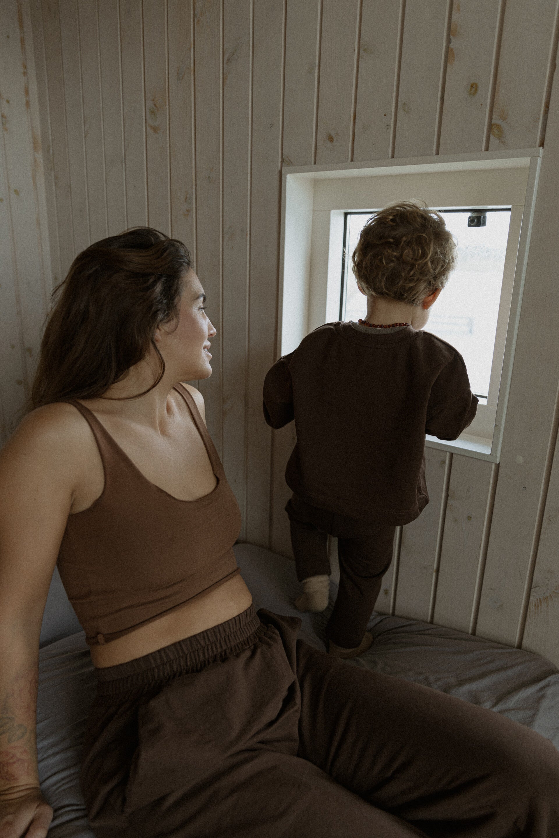 De oversized sweater is de mini-versie van onze geliefde Campfire trui, met diezelfde nonchalante charme. De bijpassende wijde broek zit vol speelse vrijheid: dankzij het elastiek in de taille en het lange model die later ook te dragen is als culotte kan deze broek lekker lang mee.